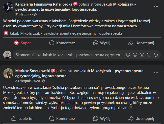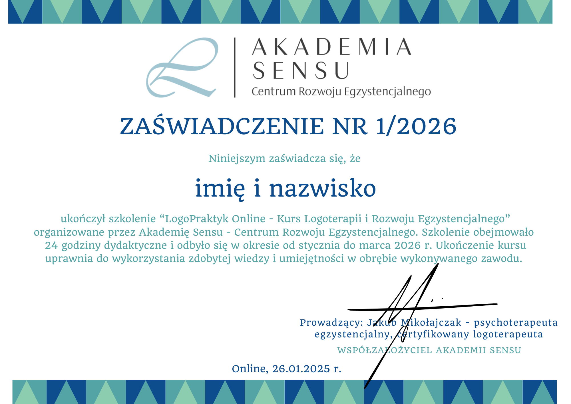 Jakub Mikołajczak – certyfikowany psychoterapeuta humanistyczno-egzystencjalny. Szkolenia z logoterapii prowadzi od 2016 r. Współzałożyciel Akademii Sensu – Centrum Rozwoju Egzystencjalnego. Jest członkiem Polskiego Towarzystwa Logoterapii i Noopsychosomatyki. Ukończył certyfikowany kurs logoterapii akredytowany przez Instytut Viktora Frankla w Wiedniu, prowadzony m.in. przez prof. Kazimierza Popielskiego, polskiego przedstawiciela logoterapii i bliskiego przyjaciela Frankla.  Więcej informacji o prowadzącym.